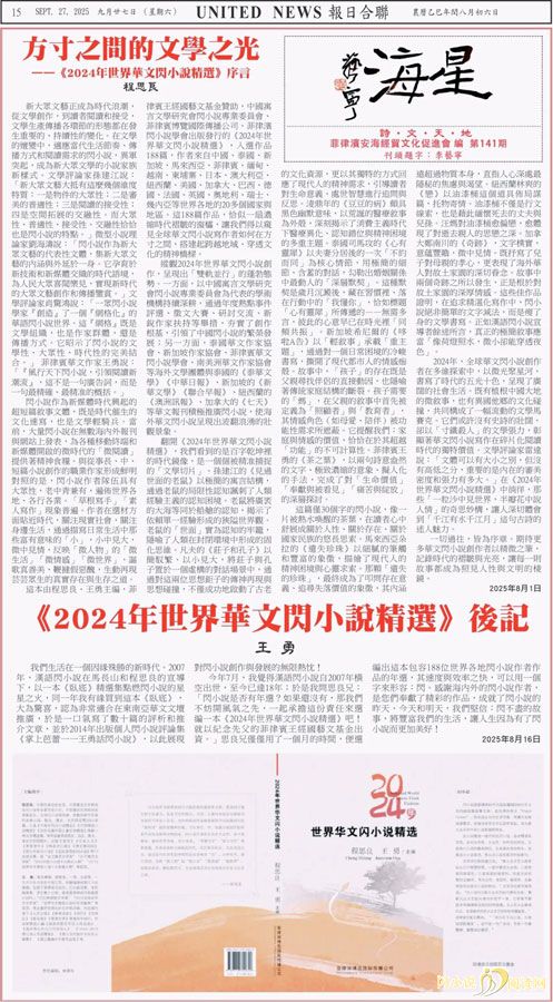 今年7月,我觉得汉语闪小说自2007年横空出世,至今已达18年;于是我问思良兄:“闪小说是否有年选?如果还没有,那我们不妨开风气之先,一起承担这份责任来选编一本《2024年世界华文闪小说精选》吧!就以纪念先父的菲律宾王经国艺文基金出资。”思良兄仅仅用了一个月的时间,便选编出这本包容188位世界各地闪小说作者作品的年选,其速度与效率之快,可以用一个字来形容:闪。