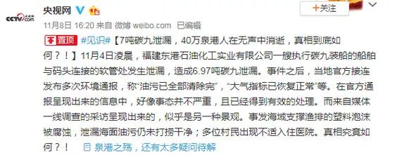 现在,泉港引以为傲的石化产业却给泉港带来不可估量的损失,水产和盐业都会受到冲击!看到渔民面对渔排一个个沉入海底,那种心痛,官们,不要为了政绩,而祸害泉州的绿水青山了,事故出现了,不要一味的回避,亡羊补牢尤未晚唉。 04  央视:碳九泄漏40万人在无声中消逝  真相是?