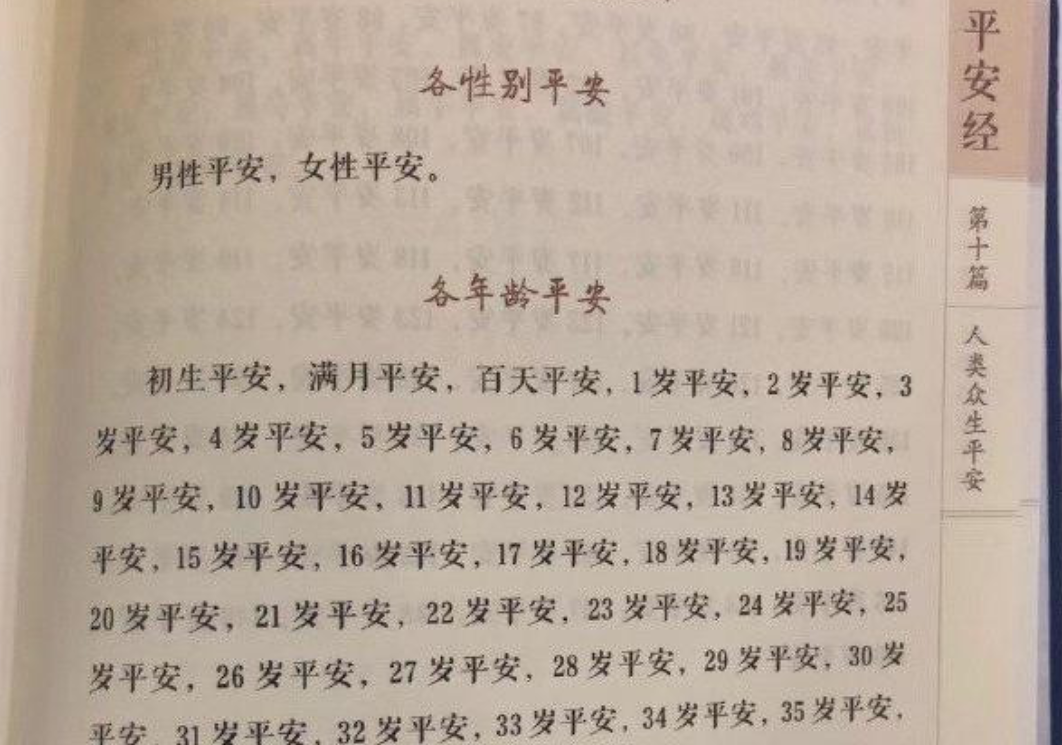 如此《平安经》能否把“作者”平安为平民百姓?  作者/谏言 “初生平安,满月平安,百天平安,1岁平安,2岁平安,3岁平安, 4岁平安, 5岁平安, 6岁平安,7 岁平安,8岁平安,9岁平安,10岁平安,11岁平安,12岁平安,13岁平安,14岁平安,15岁平安,16岁平安,17岁平安,18岁平安,19岁平安,20岁平安,……………………”