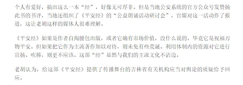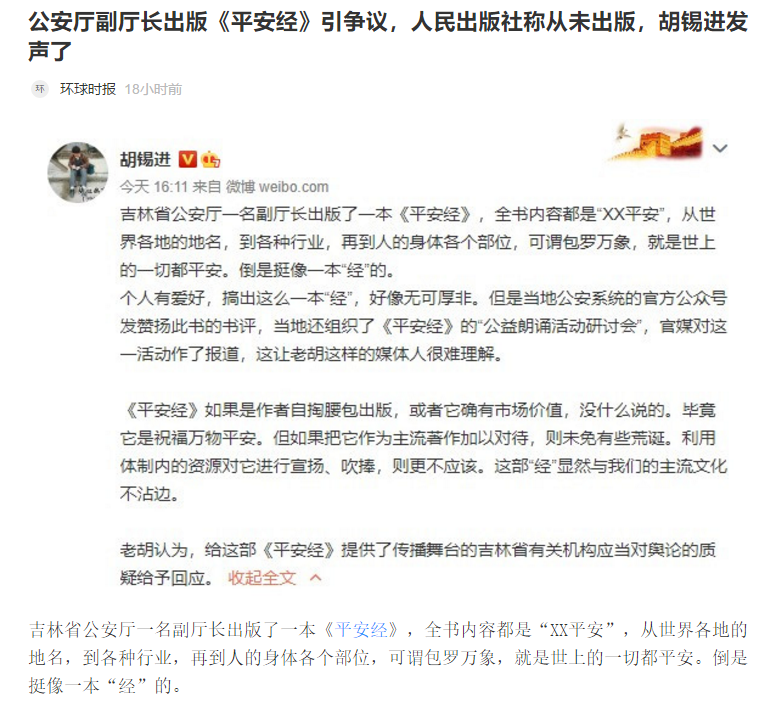 新闻背景: 公安厅副厅长出版《平安经》引争议,人民出版社称从未出版,胡锡进发声了
