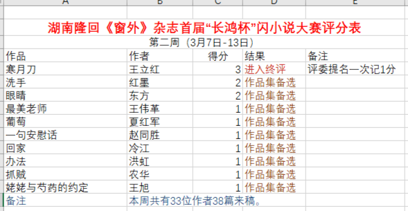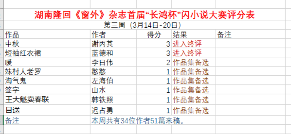 5.“湖南闪小说人”公众平台开辟“长鸿杯”专栏,展示所有进入终评作品及大赛优秀作品集初选入围作品;《窗外》等刊物选发获奖佳作。